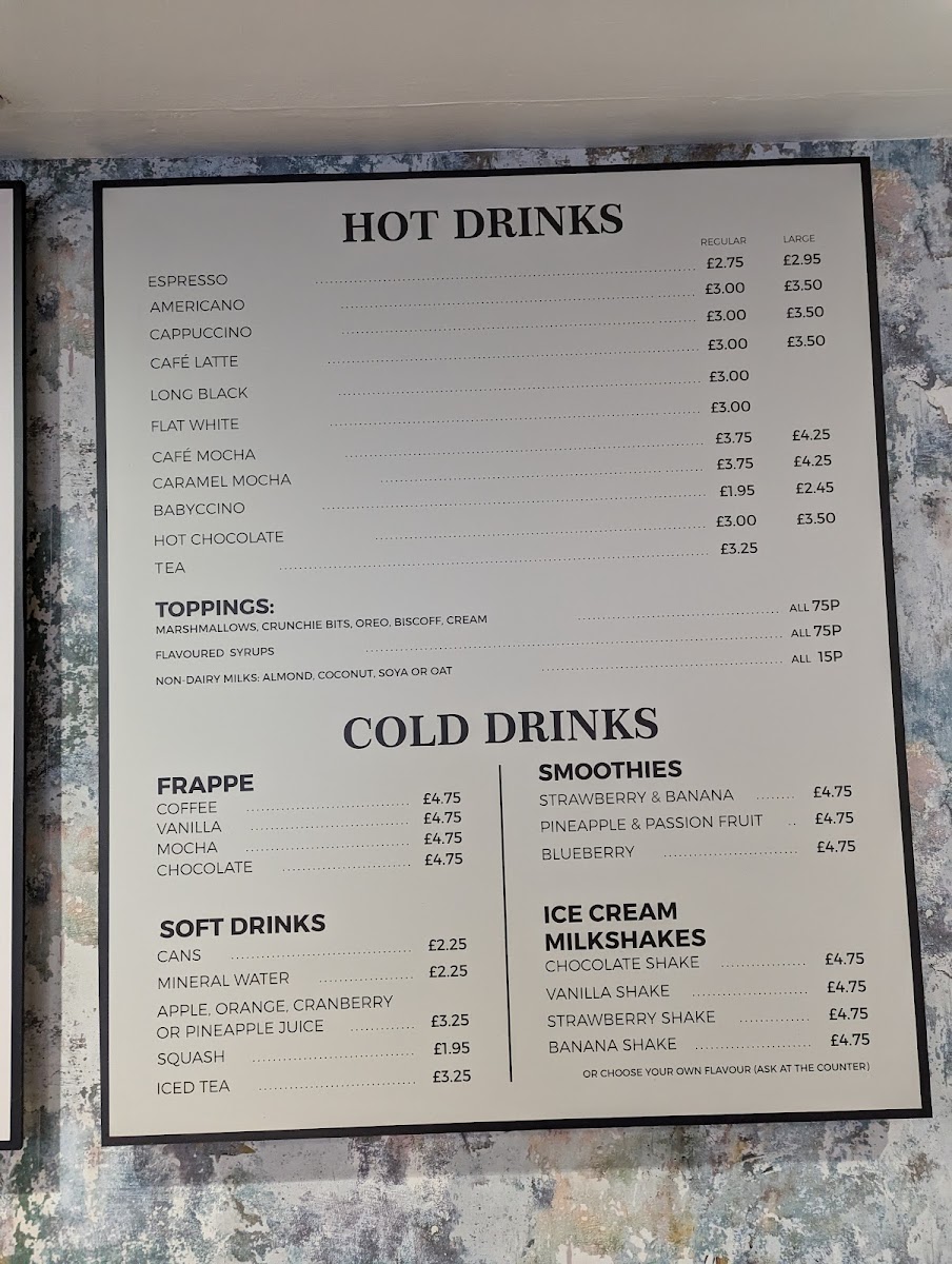 Alongside, indulge in a rich array of hot drinks, including expertly crafted coffees from £3.00, ensuring every visit warms the soul. Wash it down with a delectable frappe for just £4.95.